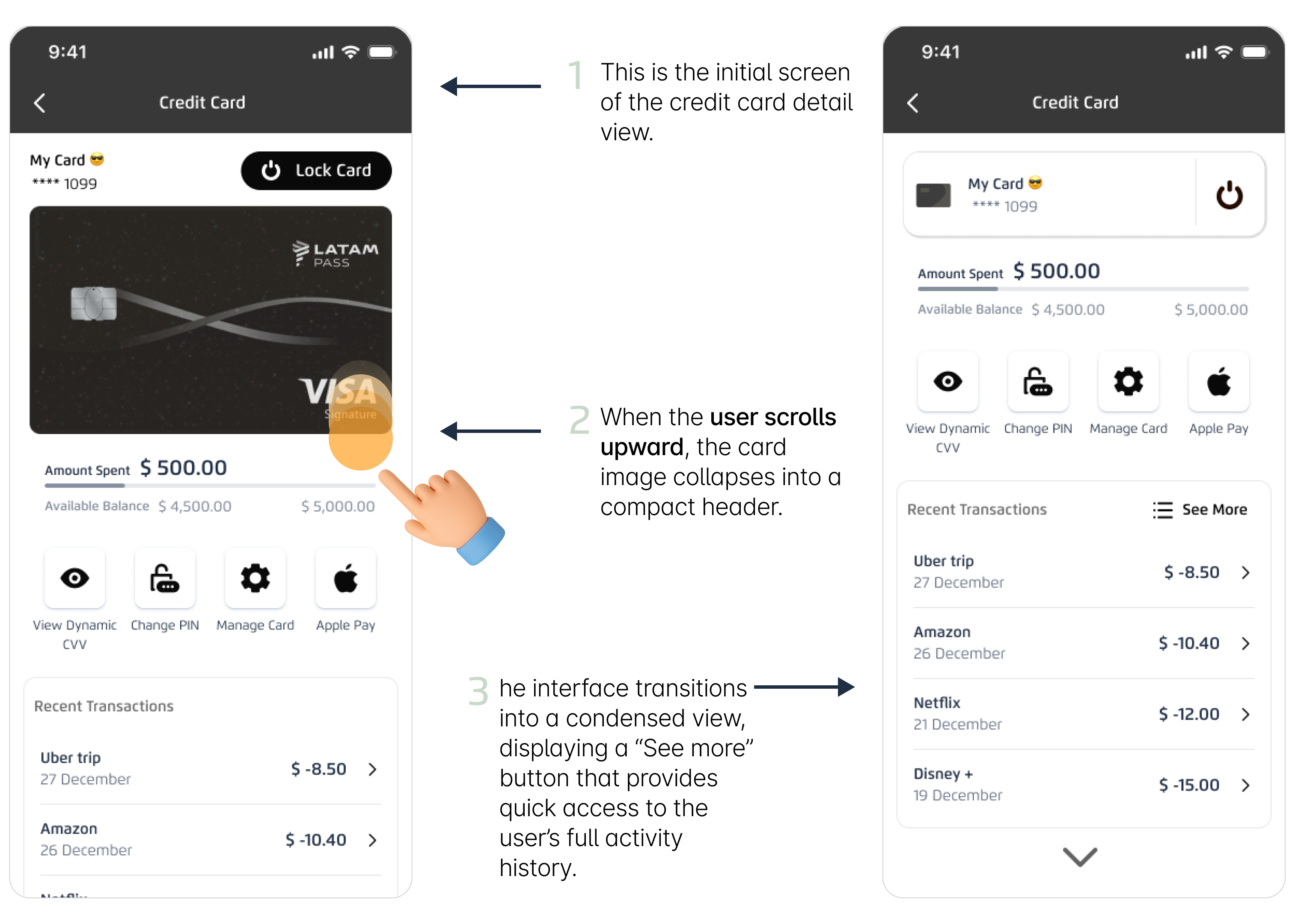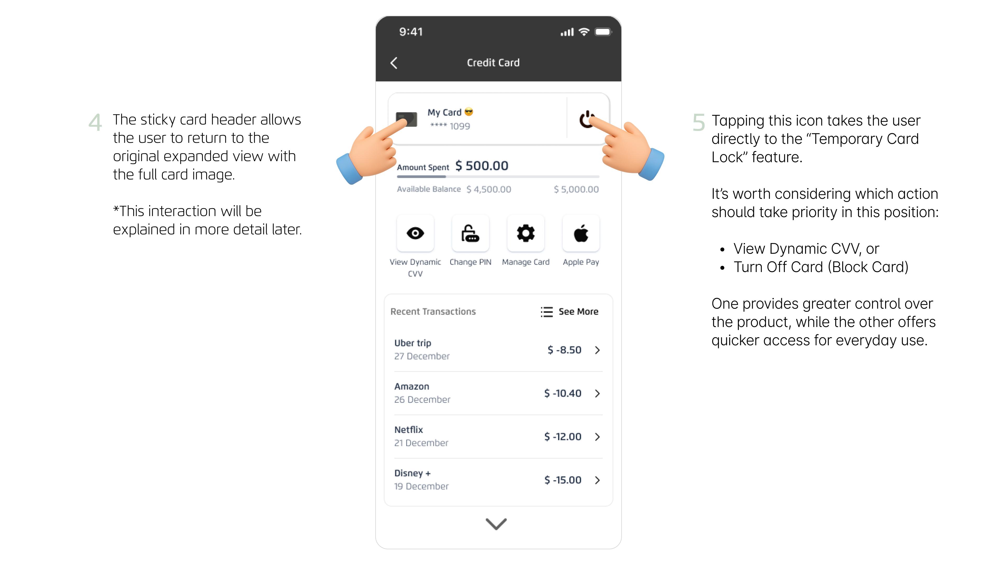 It’s important to understand how specific micro-components within the flow directly influence user orientation, sense of control, and efficiency in completing critical tasks.This section presents two key design decisions that enhance usability in the card details view: the sticky card header and the primary action placed within the header. Both elements were evaluated based on their impact on navigation, security, and quick access to essential features.
