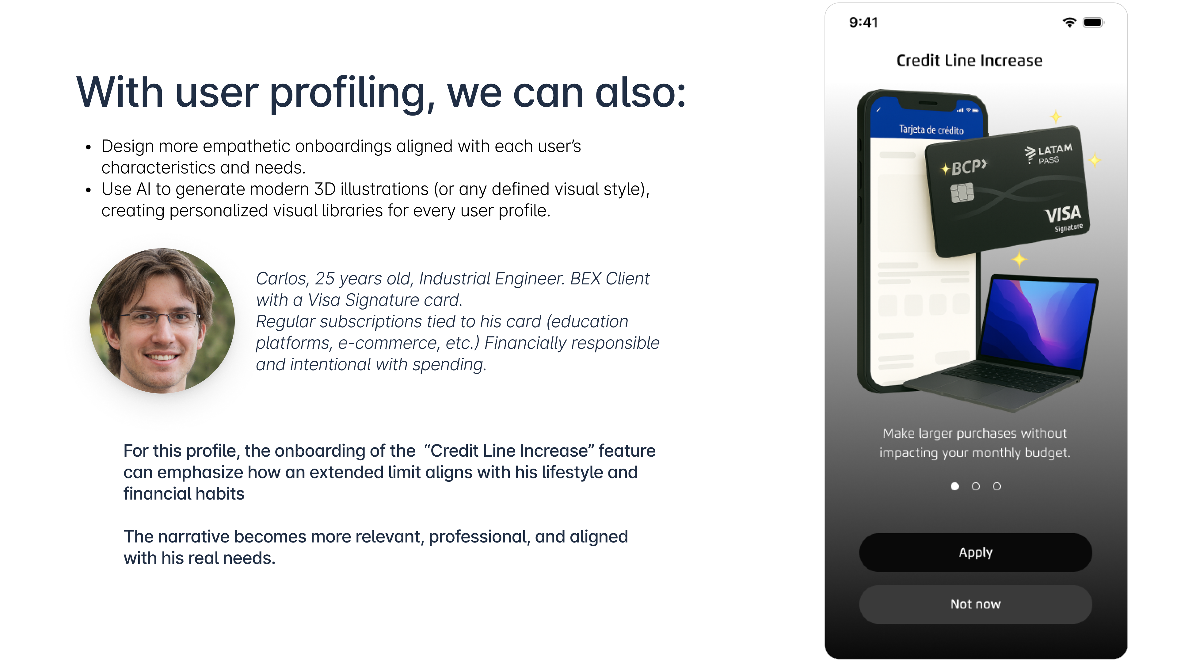 If we capture data such as a user’s monthly usage frequency, the specific features they interact with, and their general profile (age, card type, financial behavior, etc.), we gain the perfect foundation to take this banking app’s experience to a new level of personalization.
