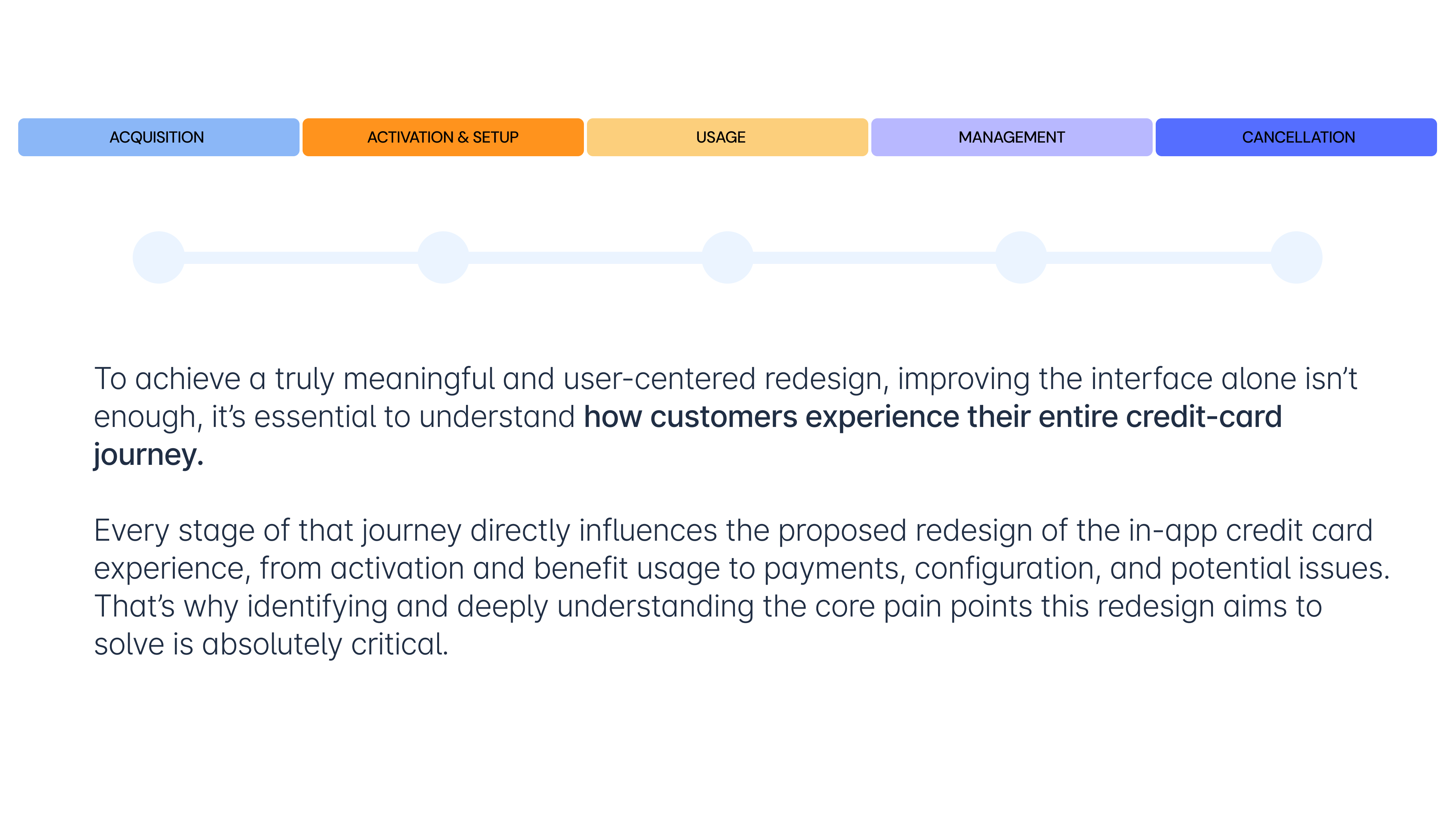 A redesign must span the entire credit-card journey, not just one screen: Every pain point in your study, acquisition, activation, usage, management, cancellation, affects the next. Treating each stage in isolation would have produced superficial improvements; mapping and designing the complete lifecycle revealed deeper opportunities.